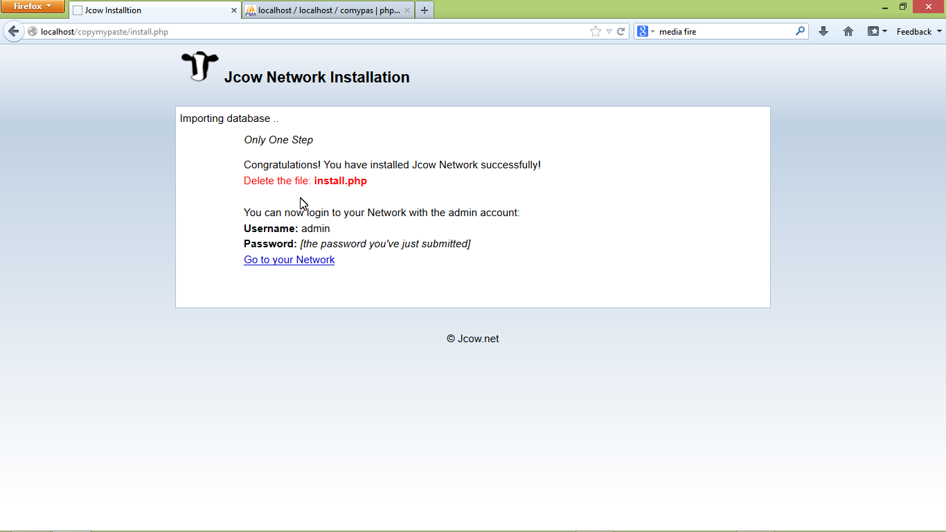 6. Hapus file Install.php dalam paket jcow anda dan klik link Go to your Network. Dan hasilnya cukup menarik.